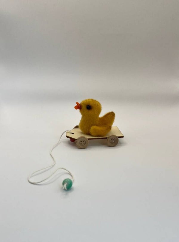 Met zijn houten karretje erbij is hij ongeveer 9 cm lang en 7 cm hoog – klein van stuk, maar groots in charme!