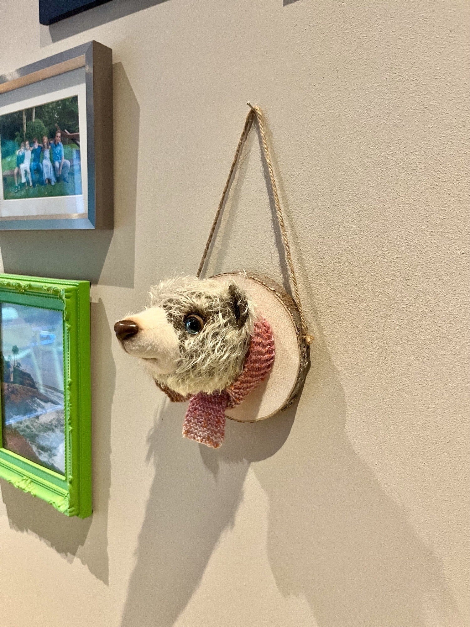 Maak kennis met Button, een handgemaakte berenkop, stevig bevestigd op een rustiek houten plankje.