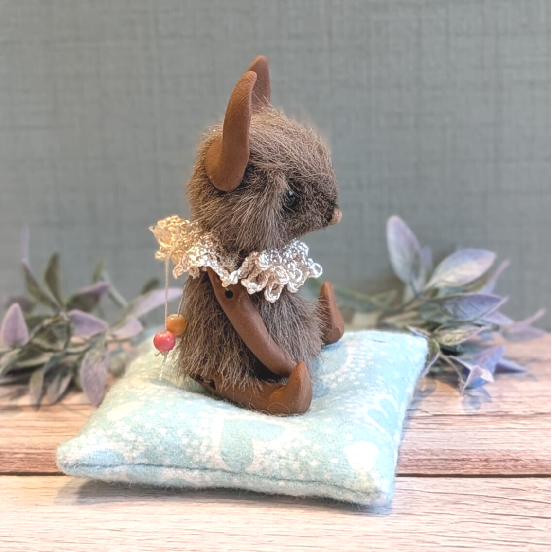 Fluff is een klein lief konijnttje van slechts 7 cm groot! Ze is met liefde en met de hand genaaid. Ze draagt een beige kraagje