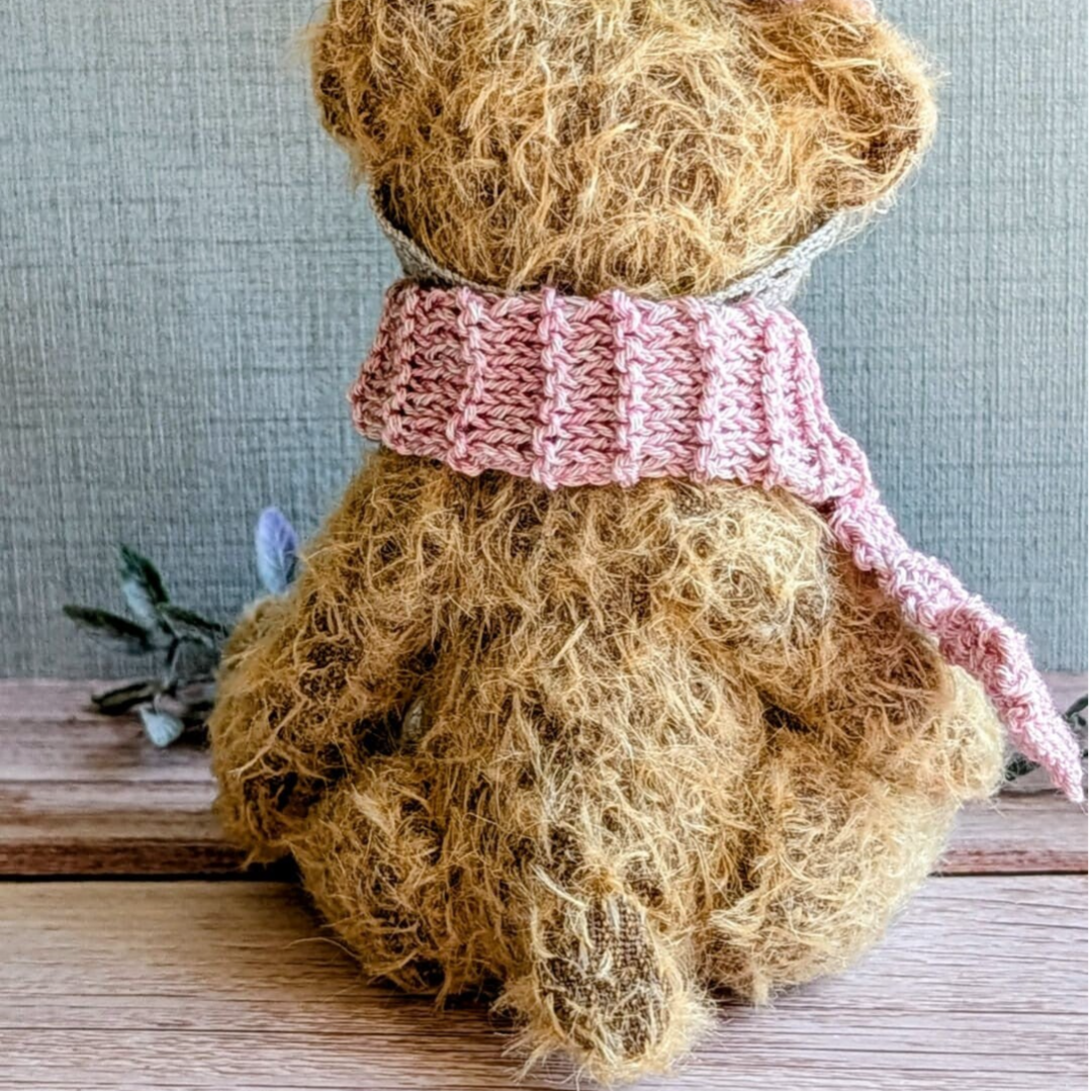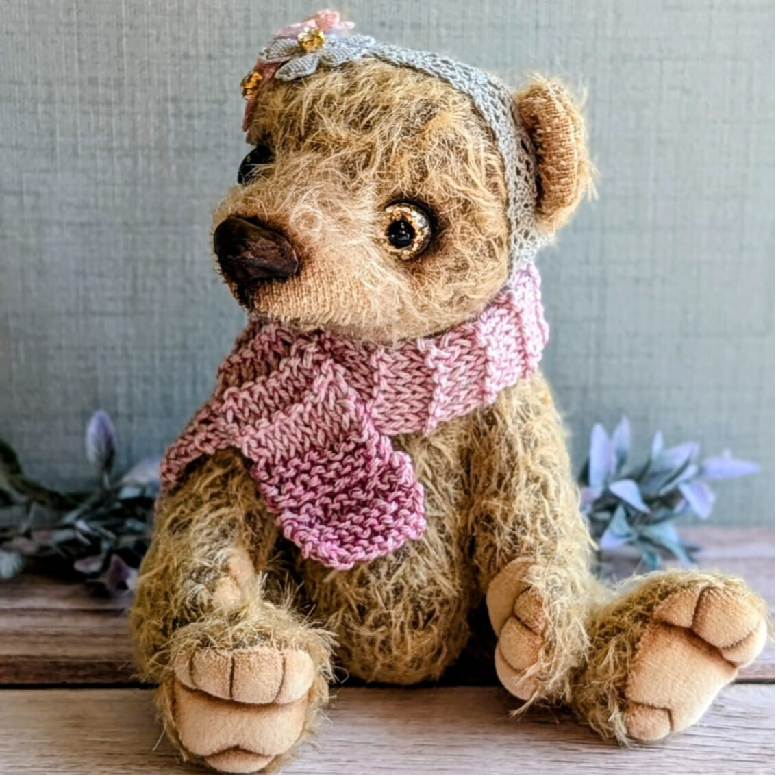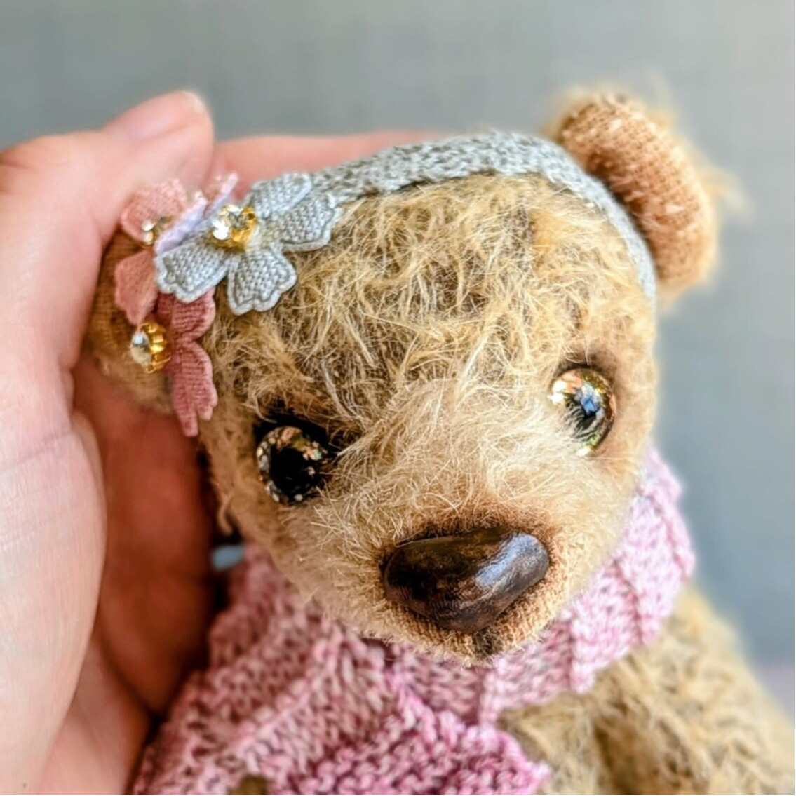 Peppa is een meisjesbeer. Ze draagt een haarband met bloemetjes en geniet van de zonnestralen op haar lichtkleurige vachtje.